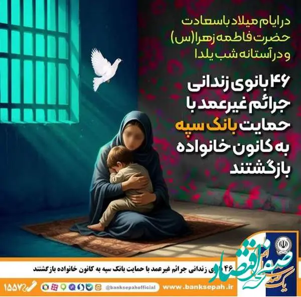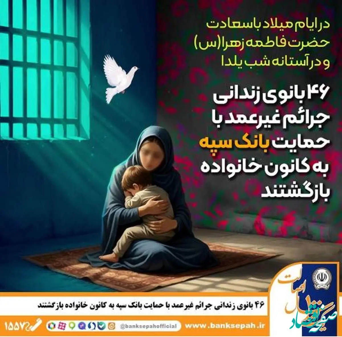 به مناسبت میلاد باسعادت حضرت فاطمه زهرا (س) و در آستانه شب یلدا، ۴۶ نفر از زندانیان زن جرائم غیرعمد با حمایت مالی بانک سپه آزاد شدند.