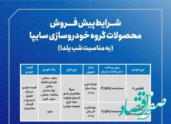 پیش فروش خودروهای اطلس S و ساینا S از سوی گروه خودروسازی سایپا ویژه متقاضیان عادی از فردا، دوشنبه ۲۰ آذر، آغاز می‌شود و تا تکمیل ظرفیت ادامه خواهد داشت. متقاضیان می‌توانند برای ثبت‌نام به سامانه فروش اینترنتی سایپا مراجعه کنند.