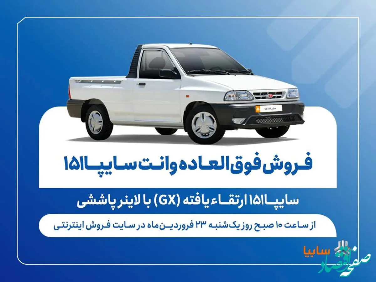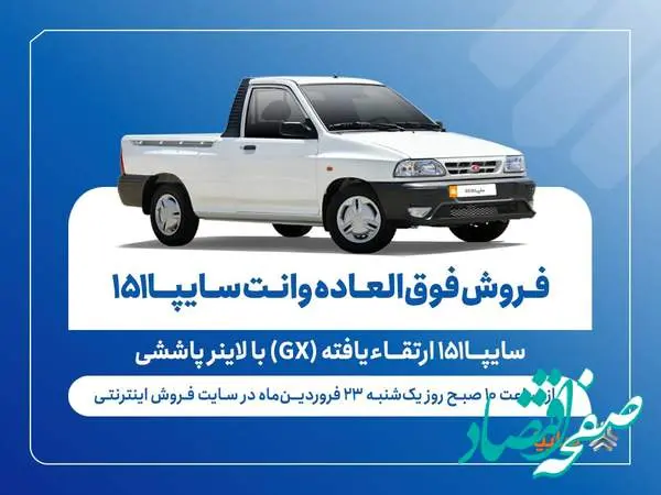 بر اساس اعلام شرکت سایپا فروش فوقالعاده وانت سایپا ۱۵۱ ارتقاءیافته (GX) از ساعت ۱۰ صبح روز یکشنبه ۲۳ فروردین ماه آغاز و تا تکمیل ظرفیت ادامه خواهد داشت.