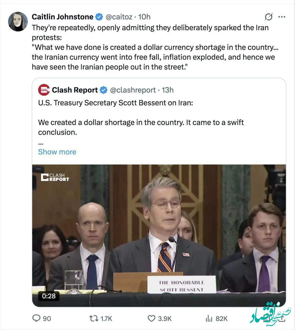 اسکات بسنت، وزیر خزانهداری آمریکا، بار دیگر مدعی شد اقدامات اقتصادی واشنگتن باعث نارضایتی مردم ایران شده و آنان را به خیابانها کشانده است.