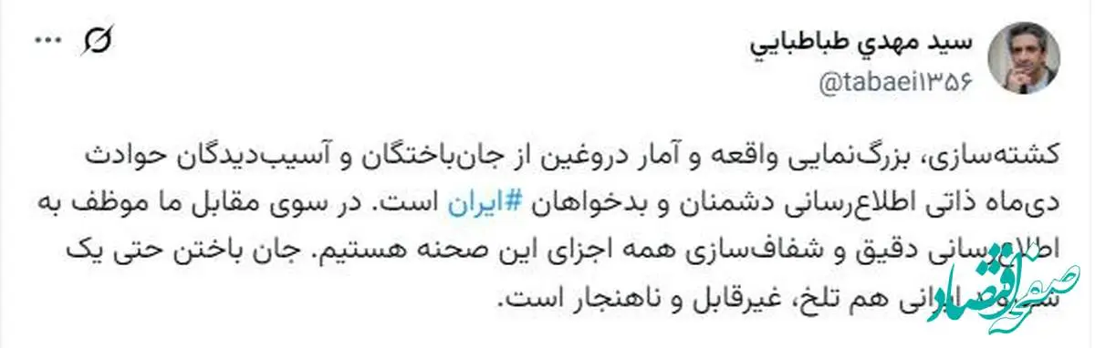 معاون ارتباطات و اطلاع‌رسانی دفتر رئیس‌جمهوری اعلام کرد که کشتارسازی، بزرگ‌نمایی حوادث و انتشار آمار دروغین درباره جان‌باختگان و آسیب‌دیدگان حوادث دی‌ماه، اقداماتی ذاتی از سوی دشمنان ایران است. وی افزود: جانباختن حتی یک شهروند ایرانی تلخ، غیرقابل‌قبول و ناهنجار است.