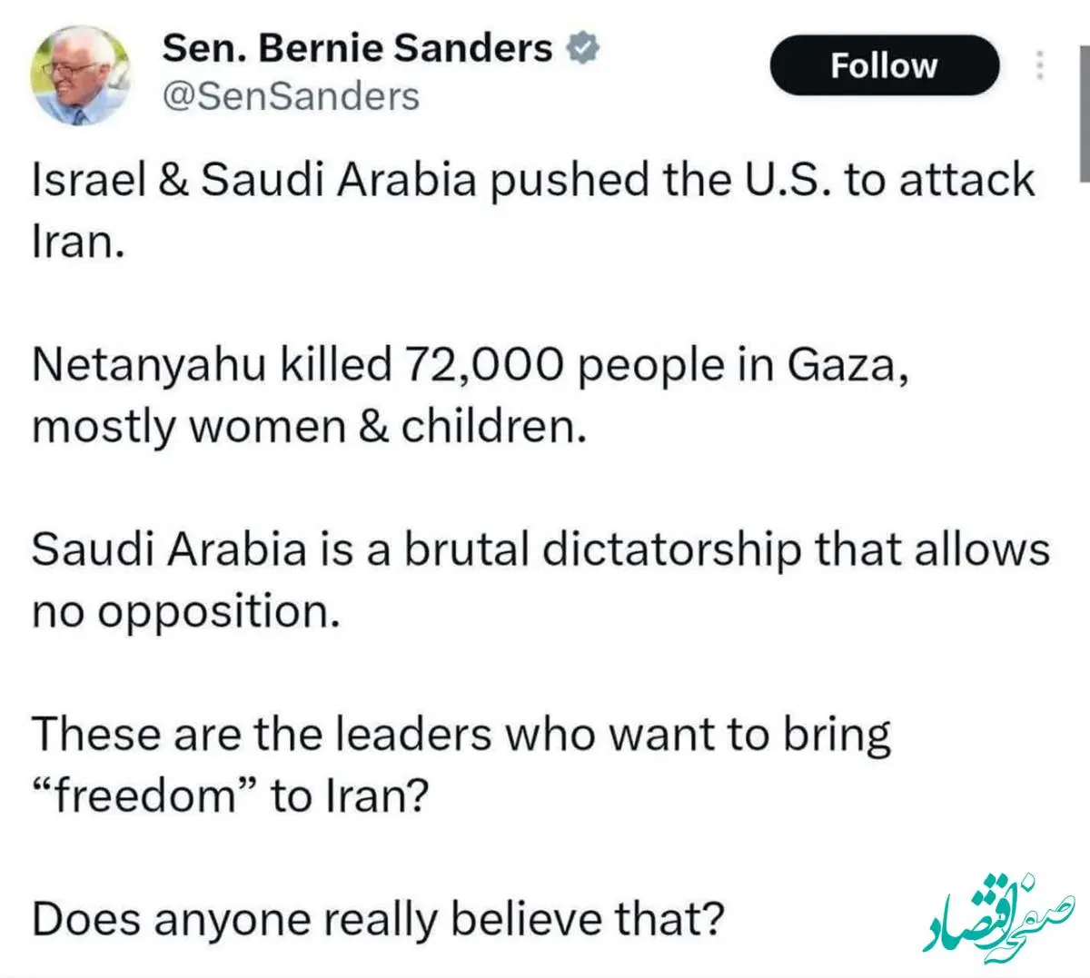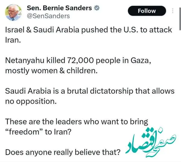 برنی سندرز، سناتور آمریکایی گفت: اسرائیل و عربستان، آمریکا را بهسمت حمله به ایران سوق دادند.