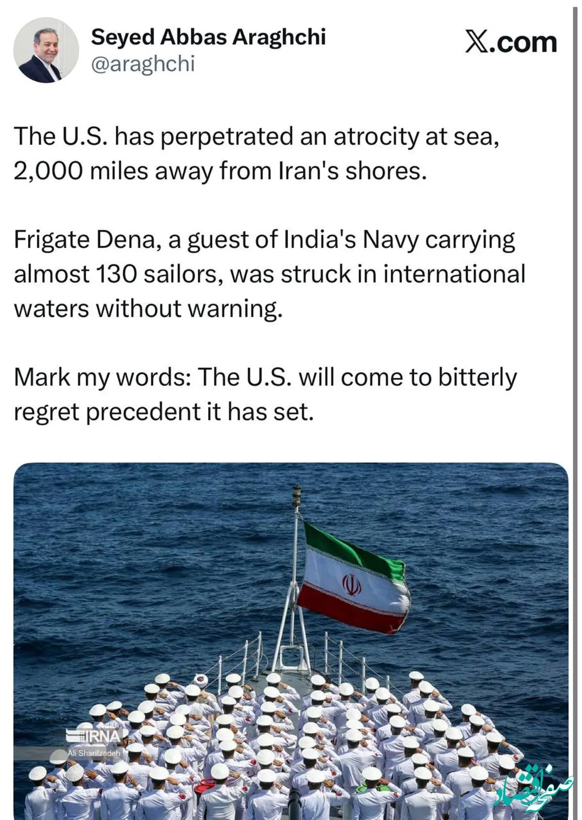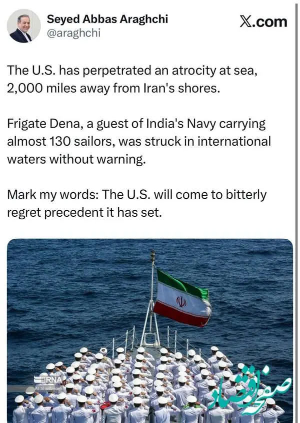 سید عباس عراقچی در واکنش به غرق شدن ناوچه دنا نوشت: پشیمان می‌شوید.