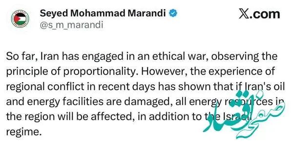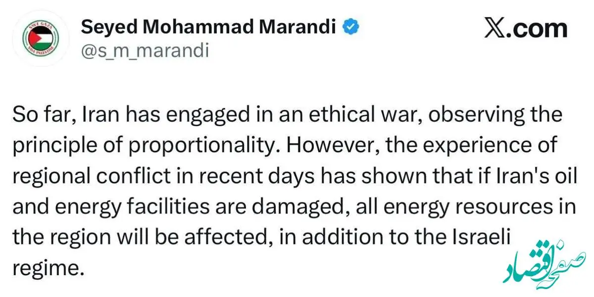 «سید محمد مرندی» تحلیلگر سیاسی نوشت: تجربه جنگ منطقهای در روزهای گذشته نشان داده چنانچه مناطق نفتی و انرژی ایران آسیب ببیند، علاوه بر اسرائیل، همه منابع انرژی در منطقه تحت تاثیر قرار خواهد گرفت.