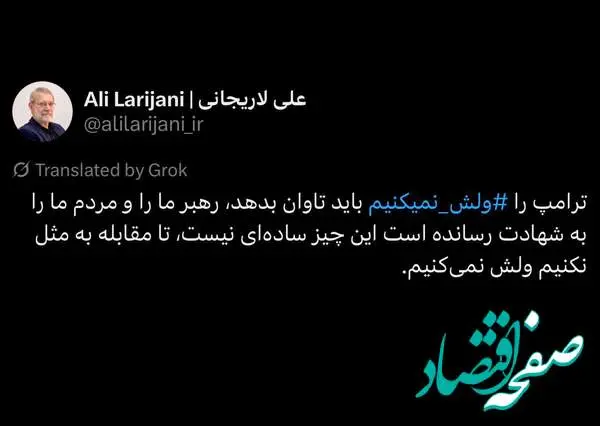 علی لاریجانی نوشت: ترامپ را ولش نمیکنیم، باید تاوان بدهد، رهبر ما را و مردم ما را به شهادت رسانده است این چیز سادهای نیست، تا مقابله به مثل نکنیم ولش نمیکنیم.