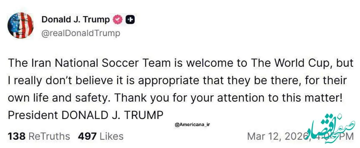 رئیس دولت تروریستی آمریکا: از حضور تیم ملی فوتبال ایران در جام جهانی استقبال میکنیم، اما فکر نمیکنم برای امنیت و جانشان مناسب باشد که شرکت کنند.