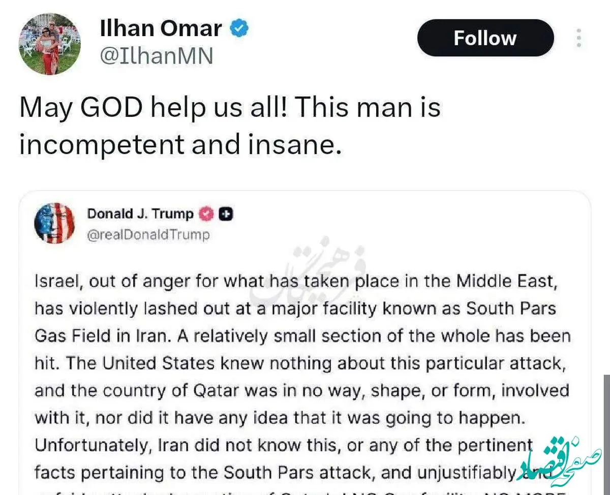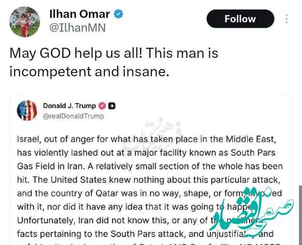 ایلهان عمر نماینده کنگره آمریکا از ایالت مینه سوتا با انتشار یک پست در فضای مجازی نوشت: خدا به همه ما کمک کند! این مرد بیکفایت و دیوانه است.