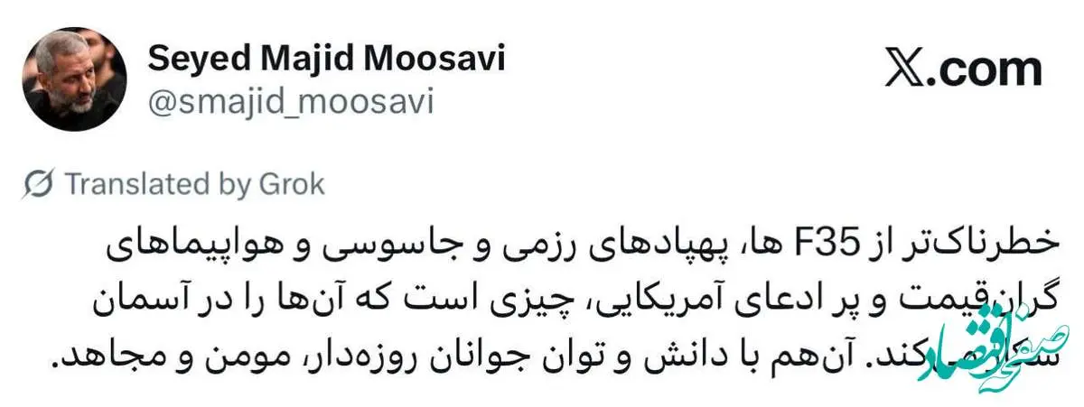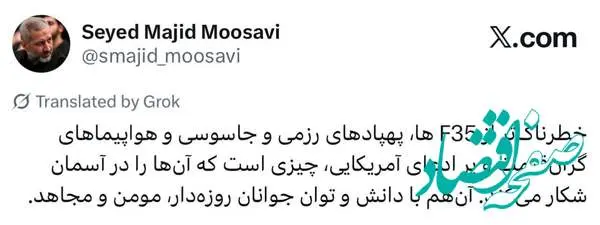 فرمانده نیروی هوافضای سپاه نوشت: خطرناکتر از F۳۵ ها، پهپادهای رزمی و جاسوسی و هواپیماهای گرانقیمت و پر ادعای آمریکایی، چیزی است که آنها را در آسمان شکار میکند.