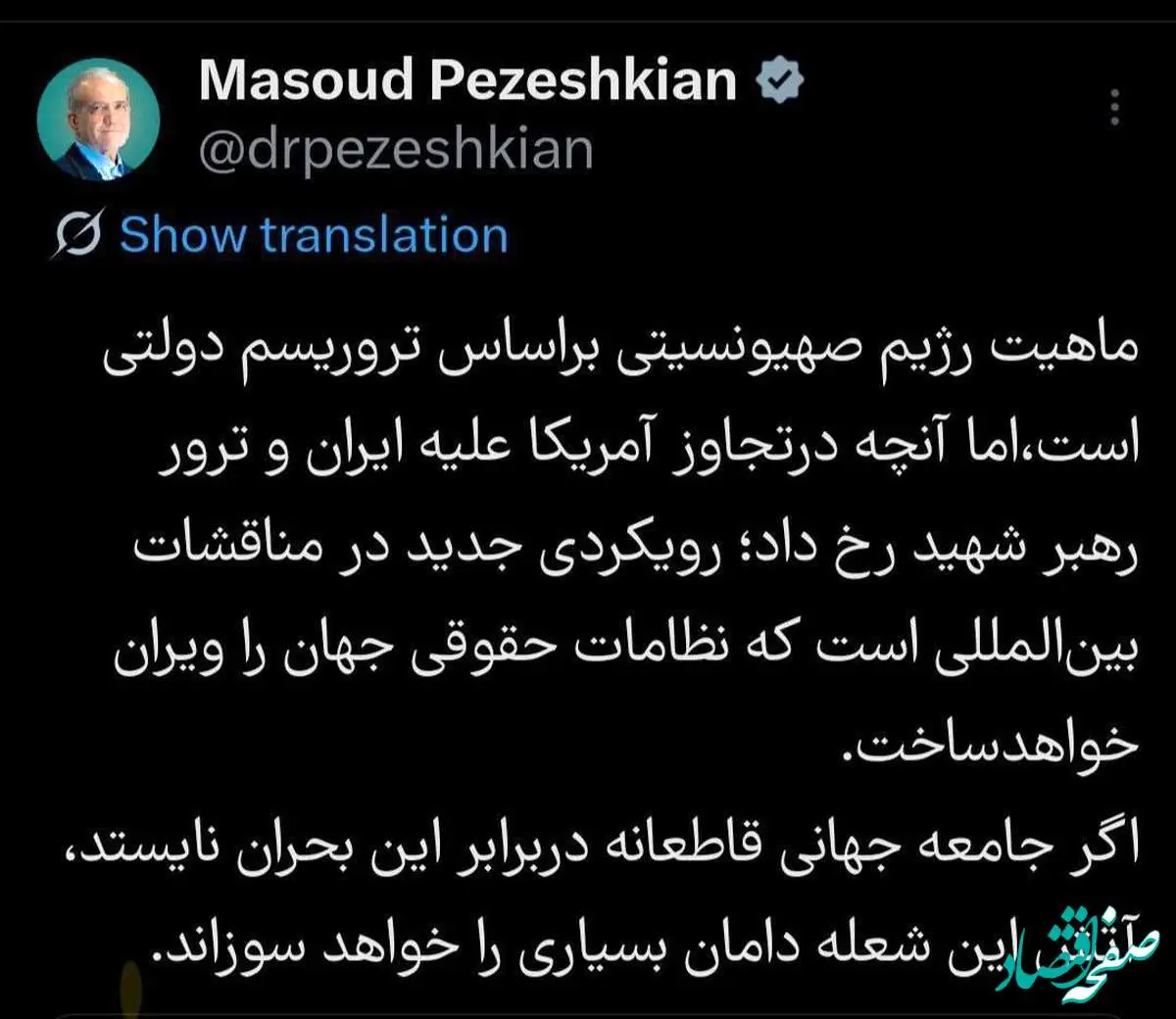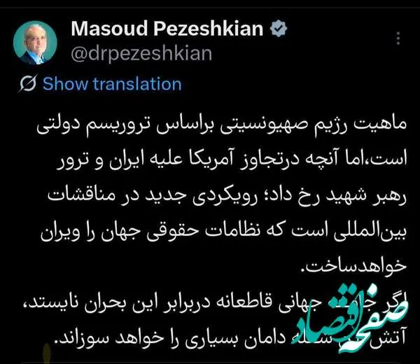 رئیس جمهور کشورمان نوشت: ‏ماهیت رژیم صیونسیتی براساس ترورریسم دولتی است،اما آنچه درتجاوز آمریکا علیه ایران و ترور رهبر شهید رخ داد؛ رویکردی جدید در مناقشات بین‌المللی است که نظامات حقوقی جهان را ویران خواهدساخت.