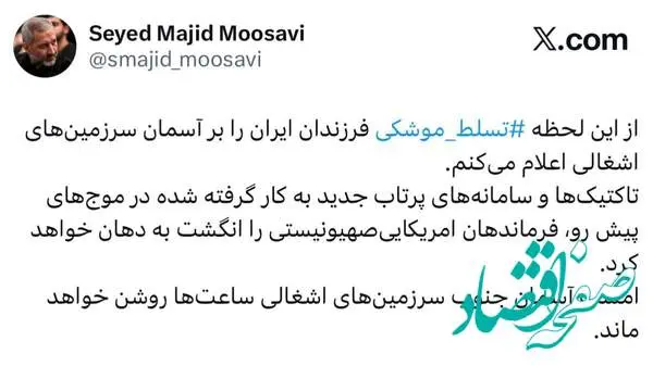 سید مجید موسوی: آسمان جنوب سرزمینهای اشغالی امشب ساعتها روشن خواهد ماند