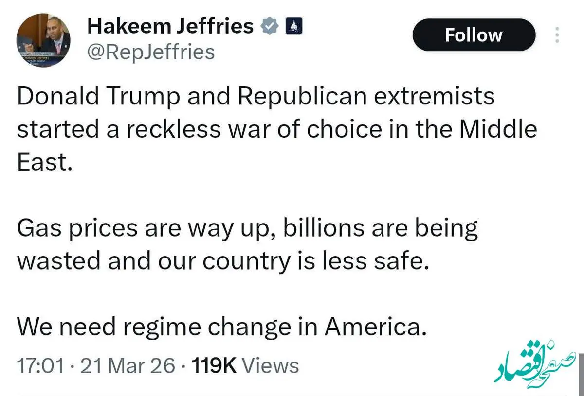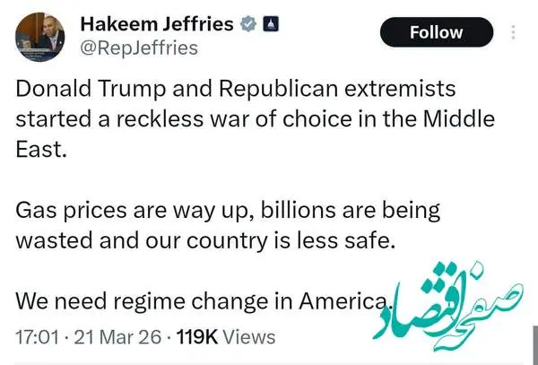 حکیم جفریز رهبر دموکراتها در مجلس نمایندگان آمریکا نوشت: ما در آمریکا به تغییر رژیم نیاز داریم.