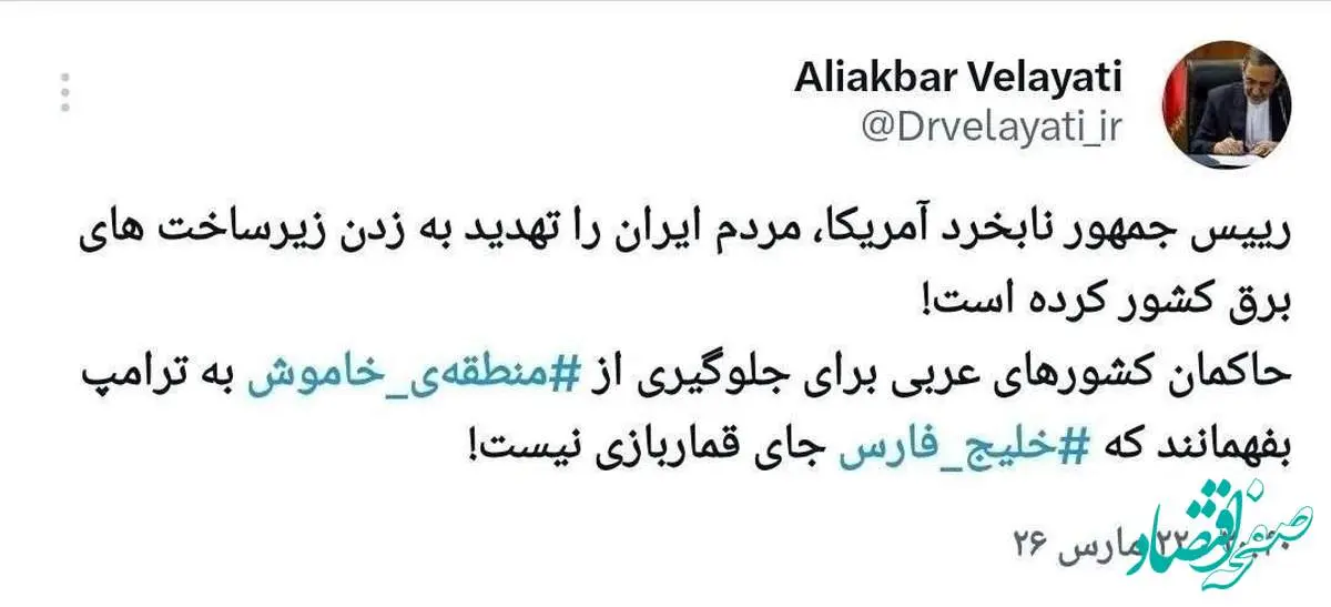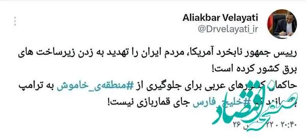 علی اکبر ولایتی‌ نوشت: کشورعلی عربی برای جلوگیری از ‎منطقه‌ى خاموش به ترامپ بفهمانند که ‎خلیج‌ فارس جای قماربازی نیست!