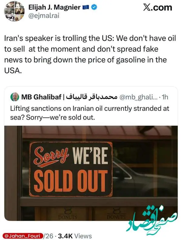 «ایران دارد آمریکا را مسخره میکند: ما در حال حاضر نفت نداریم بفروشیم و اخبار جعلی برای پایین آوردن قیمت بنزین در آمریکا منتشر نکنید.»