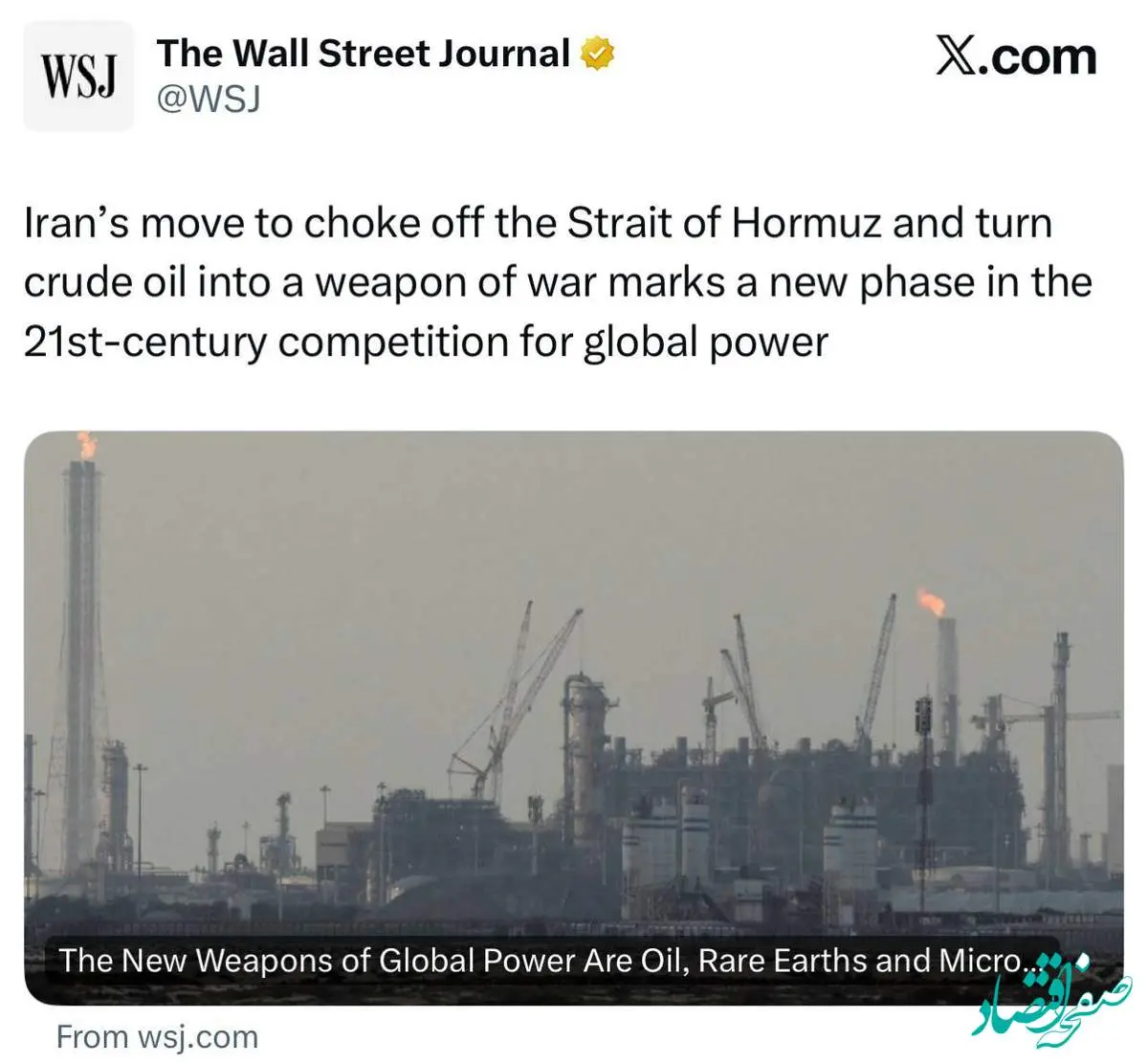 والاستریتژورنال: اقدام ایران برای بستن تنگه هرمز و تبدیل نفت خام به سلاح جنگی، مرحله جدیدی از رقابت برای قدرت جهانی در قرن بیست و یکم را رقم میزند.