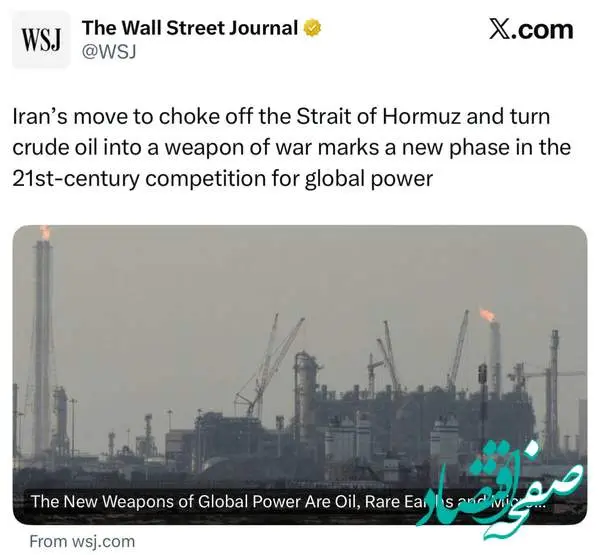 والاستریتژورنال نوشت: اقدام ایران برای بستن تنگه هرمز و تبدیل نفت خام به سلاح جنگی، مرحله تازه ای از رقابت برای قدرت جهانی در قرن ۲۱ را رقم میزند.