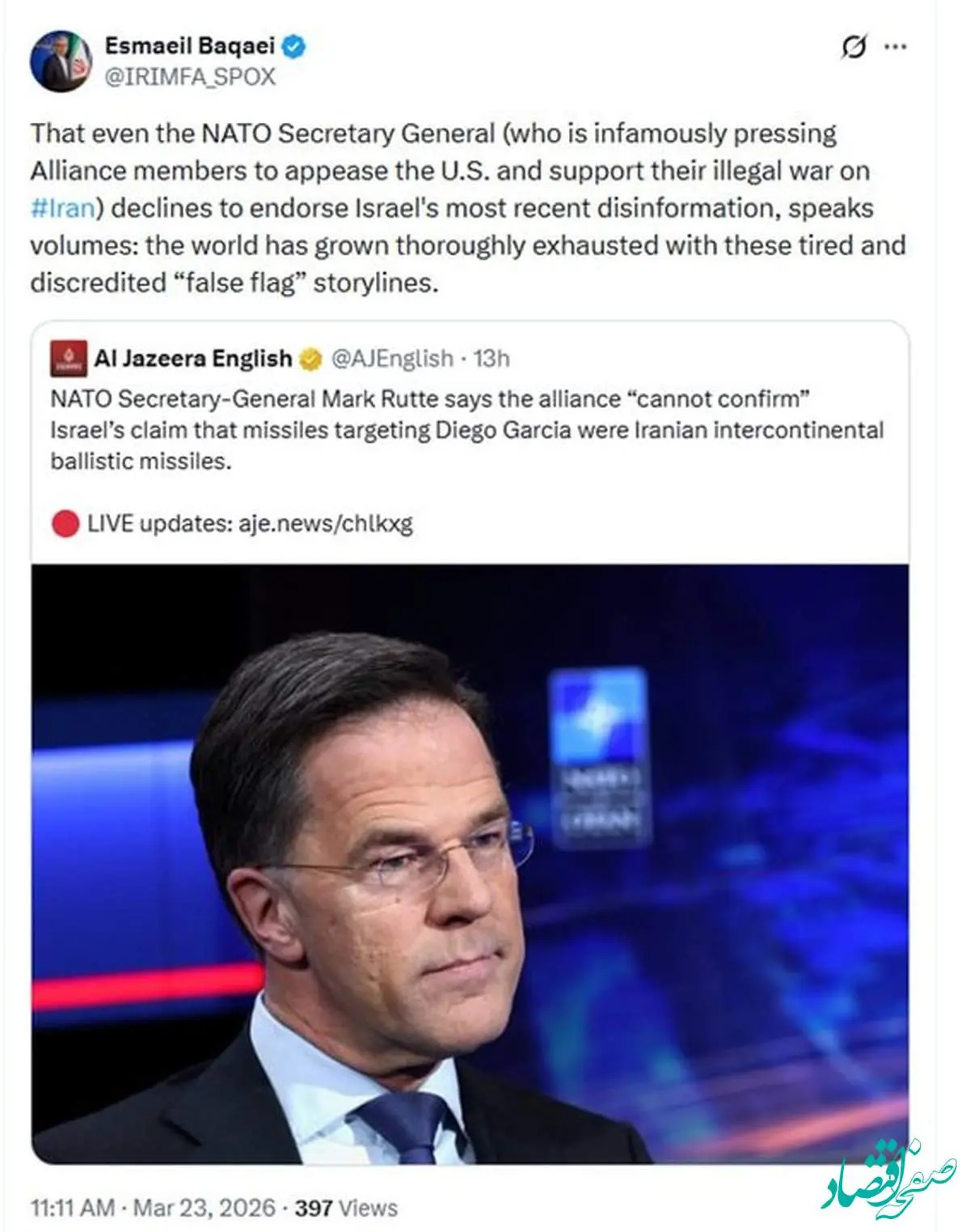 اسماعیل بقائی سخنگوی وزارت امور خارجه، با اشاره به موضع‌گیری دبیرکل ناتو در رد ادعای اخیر مقامات رژیم صهیونیستی درباره تهدید موشکی ایران برای اروپا، در مطلبی در شبکه اجتماعی ایکس نوشت: «اینکه حتی فردی مثل دبیرکل ناتو (که خود را به‌خاطر اعمال فشار بر اعضای ناتو جهت حمایت از جنگ غیرقانونی آمریکا-اسرائیل علیه ایران بدنام کرده است) هم از تایید جدیدترین دروغ اسرائیلی‌ها خودداری می‌کند، بسیار معنادار است: همه دنیا از شنیدن داستان‌سرایی‌های مبتنی بر پرچم دروغین، به ستوه آمده است».
