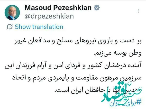 رئیس‌جمهور در شبکه اجتماعی ایکس نوشت: ‏بر دست و بازوی نیروهای مسلح و مدافعان غیور وطن بوسه می‌زنم.