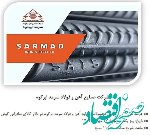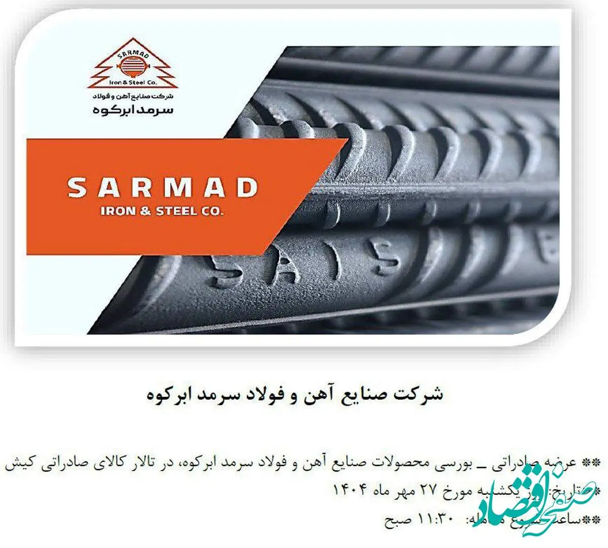 محصولات صنایع آهن و فولاد سرمد ابرکوه، روز یکشنبه ۲۷ مهر ۱۴۰۴ در تالار کالای صادراتی بورس کیش عرضه میشود.