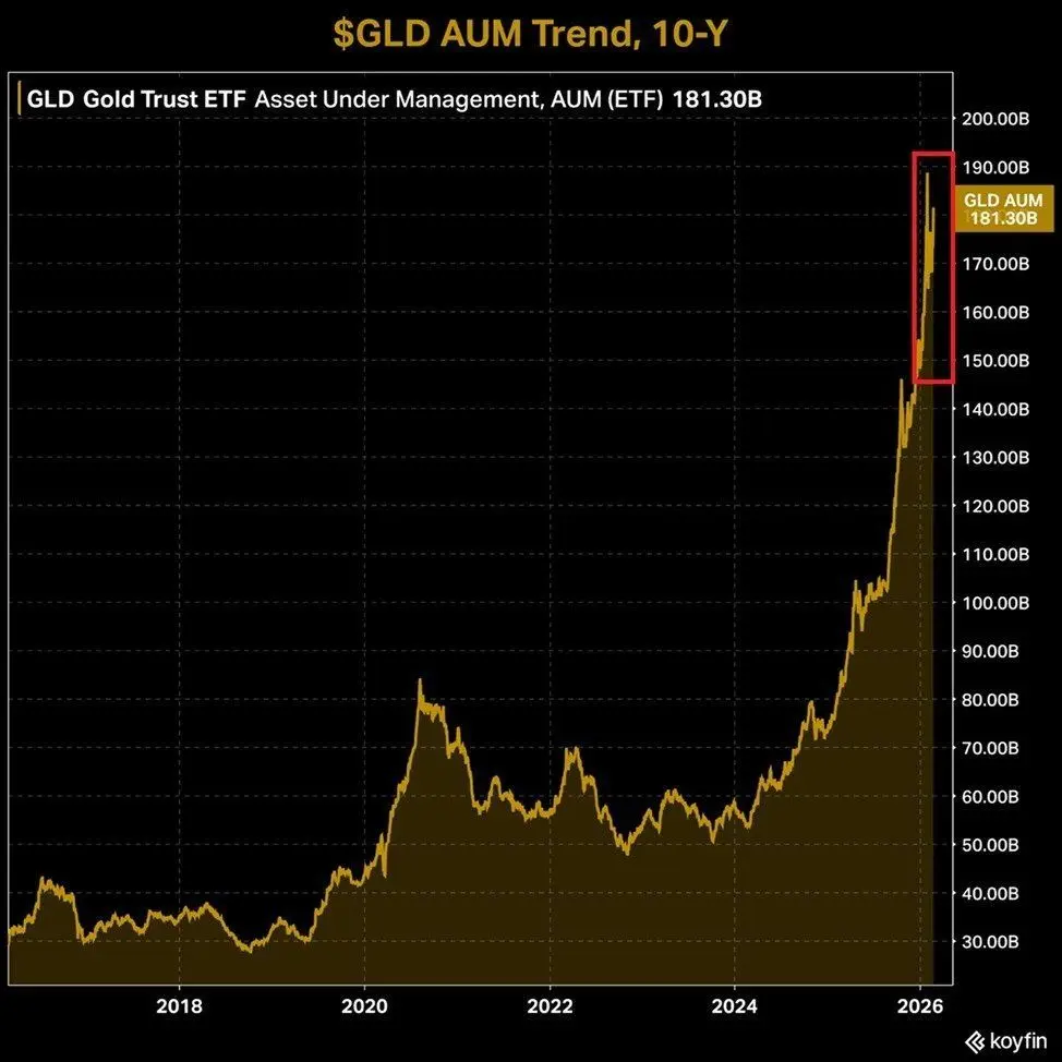 ارزش دارایی‌های تحت مدیریت (AUM) در بزرگ‌ترین ETF مبتنی بر طلا در آمریکا، یعنی SPDR Gold Shares (GLD)، به ۱۸۱ میلیارد دلار رسیده که در نزدیکی سقف تاریخی خود قرار دارد. "ای یو ام " این صندوق در کمتر از یک سال دو برابر شده است.