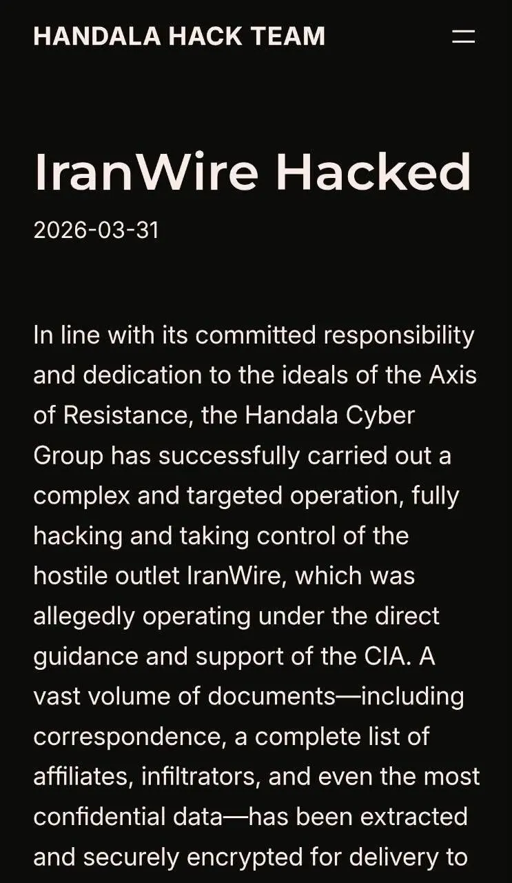 در چارچوب مسئولیت متعهدانه و پایبندی به آرمانهای محور مقاومت، گروه سایبری حنظله با موفقیت یک عملیات پیچیده و هدفمند را اجرا کرده و بهطور کامل رسانهٔ خصمانه «ایرانوایر» را هک کرده و کنترل آن را در دست گرفته است؛ رسانهای که ادعا میشود تحت هدایت و حمایت مستقیم سازمان سیا فعالیت میکرده است.