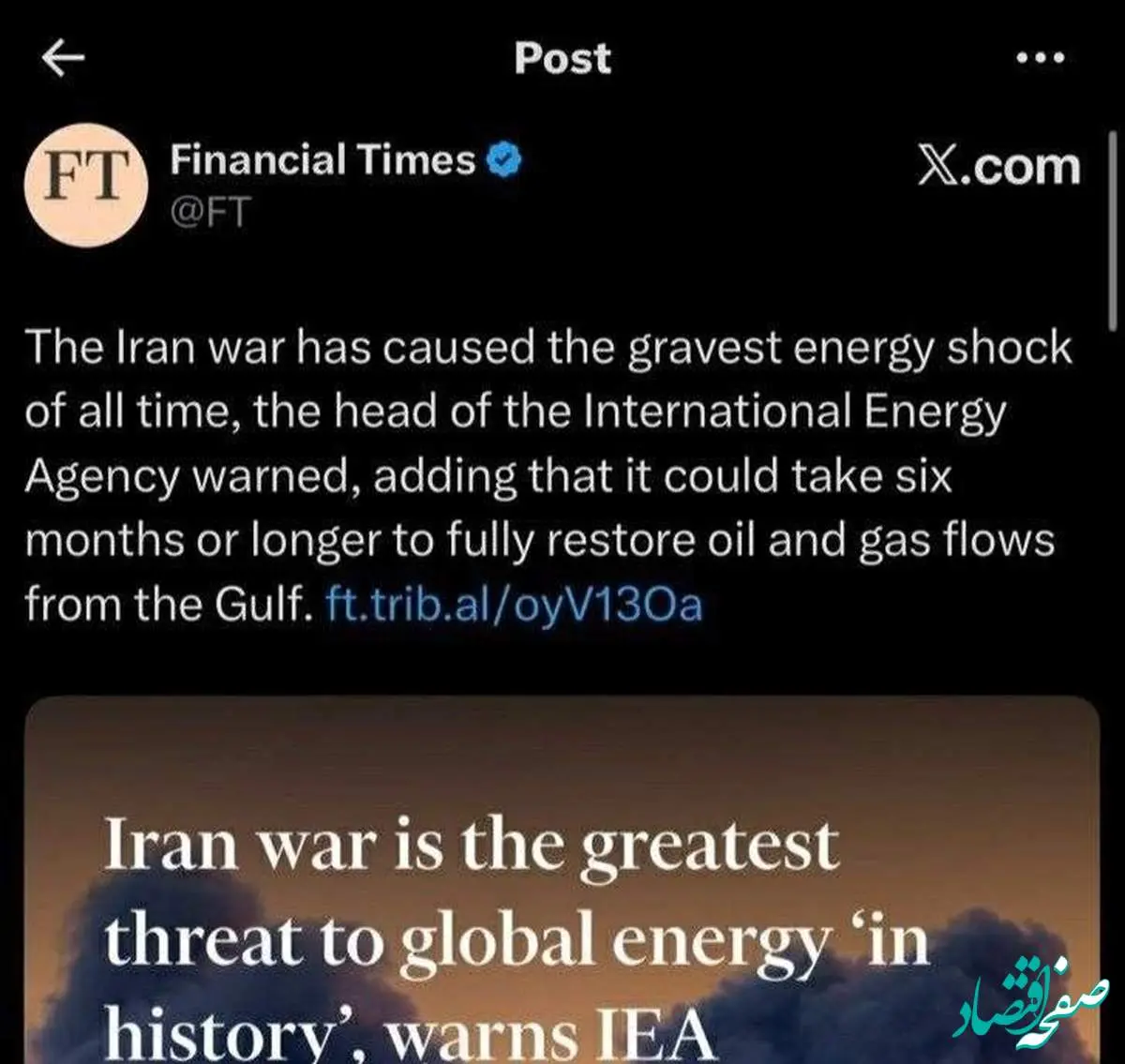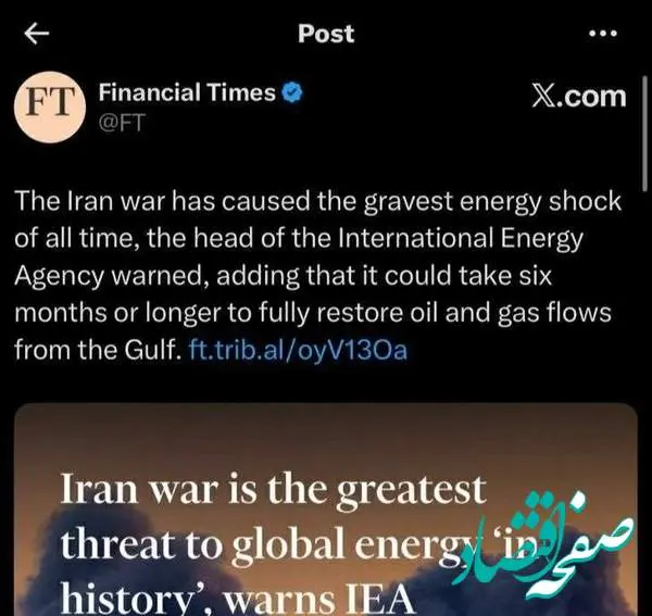 فایننشال‌تایمز به نقل از رئیس آژانس بین‌المللی انرژی هشدار داد که جنگ ایران شدیدترین شوک انرژی در تاریخ را ایجاد کرده است.