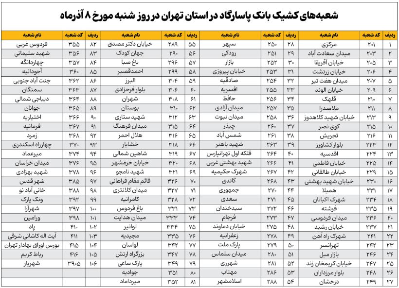 به اطلاع مشتریان ارجمند می‌رساند، با توجه به تداوم آلودگی هوا و بر اساس تصمیم استانداری تهران و ابلاغیه کانون بانک‌ها و مؤسسات اعتباری خصوصی، ارائه خدمات به مشتریان گرامی در روز شنبه، ۸ آذرماه ۱۴۰۴، از طریق شعبه‌های کشیک و در بازه زمانی ۷:۳۰ الی ۱۳:۳۰ انجام خواهد شد. بدین‌وسیله فهرست شعبه‌های کشیک بانک پاسارگاد در استان تهران برای روز شنبه ۸ آذرماه به شرح زیر اعلام می‌گردد.