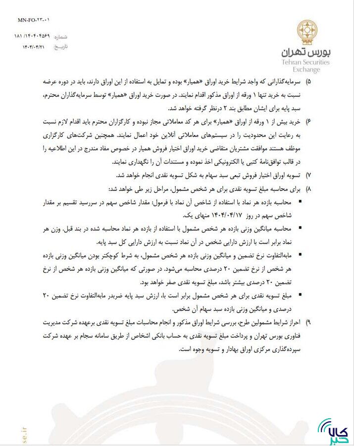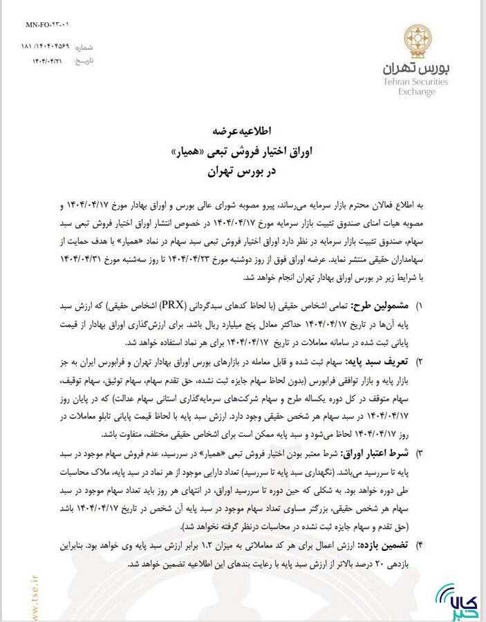 مهدی زمانی با بیان اینکه طبق اطلاع رسانیهای پیشین، از امروز نماد «همیار» در بورس تهران گشایش یافت و آماده خرید توسط سهامدارانی است که ارزش پرتفوی آنها در تاریخ ۱۷ تیرماه ۱۴۰۴ حداکثر ۵۰۰ میلیون تومان بوده، افزود: اشخاص میتوانند با خرید یک برگ اوراق از نماد «همیار» به ارزش معاملاتی «یک ریال» از طریق سامانههای کارگزاری، پرتفوی خود را به میزان حداقل ۲۰ درصد در بازه زمانی یکسال آینده بیمه کنند. البته شرط استفاده از بیمه با نرخ تضمین ۲۰ درصدی، عدم فروش سهام موجود در پرتفوی مورخ ۱۷ تیرماه ۱۴۰۴ خواهد بود. البته فروش دارایی از خریدهای بعدی تا میزانی که از پرتفوی ۱۷ تیر کمتر نشود، خللی در اعتبار بیمه «همیار» ایجاد نخواهد کرد.