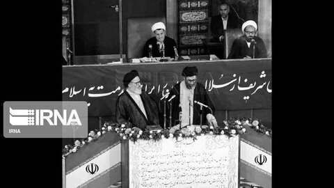 عکس دیدنی از مراسم سوگند خوردن آیت الله خامنه ای و آیت الله هاشمی /ماجرای حضور محمد یزدی و موسوی اردبیلی چیست؟