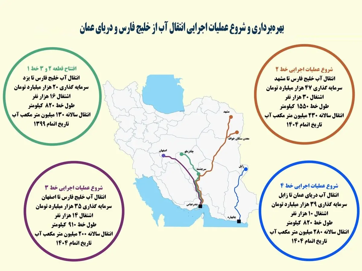 در جهت جبران خشکسالی و کمبود آب، بهرهبرداری از خط اول انتقال آب خلیج فارس به فلات مرکزی (استانهای هرمزگان، کرمان و یزد) توسط وزارت صمت آغاز شد و همچنین آغاز خط دوم طرح انتقال آب دریای عمان تا مشهد و اجرای فاز زودهنگام خط لوله زاهدان، طرح انتقال آب به استان اصفهان و اجرای فاز زودهنگام سیرجان تا اصفهان از جمله اقداماتی است که وزارت صمت آن را دنبال کرد.